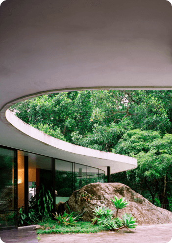 A integração com a paisagem não se restringe à transparência, composta em torno de uma grande rocha encontrada no terreno, a casa a incorpora de maneira muito poética. Incrustada entre o interior e o exterior da residência, essa rocha parece determinar os contornos da piscina, contrastando ao mesmo tempo, com a delicada leveza da estrutura e da volumetria da casa de forma geral.