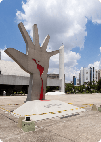 Prevaleceram ainda neste conjunto as grandes superfícies curvas, brancas, a se repetirem em função da unidade. E na praça, a mão aberta que Oscar desenhou, com sete metros de altura, o sangue a correr até o punho, representando a América Latina.